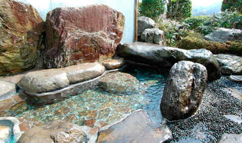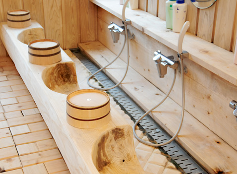 大風呂は浴槽のヒノキをはじめ、床・壁にも天然木を使用しております。心地よい香りで満ちた空間の中で日常を忘れて心も体もリフレッシュしていただけます。開放的な露天風呂は、大きな岩を組み合わせたダイナミックな浴槽です。
